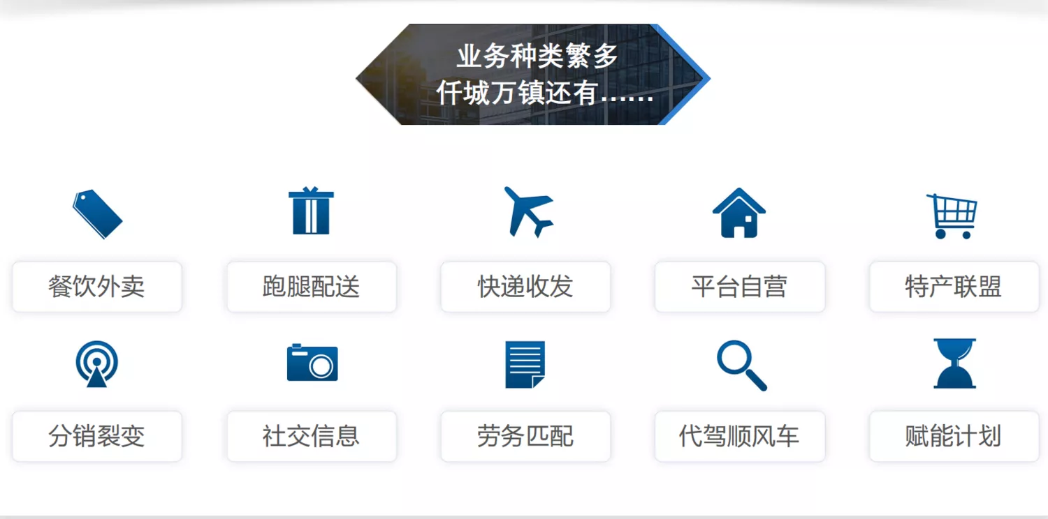 针对3-6线中小型城市、乡镇,以同城生活服务平台为基础,打造城与城、城与乡之间的巨型网络平台;
